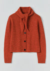 Cardigan made from a flecky merino wool spun in Donegal. With an integral neckerchief at the ribbed neckline, designed to be tied at the front. Finished with ribbed edges and corozo buttons.