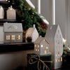 Village House Dormer House lets you know that this house is full, even to the top reaches. Imagine children's bedrooms or attic rumpus rooms in the upper level of this house with light spilling out showing that those inside are awake and well. Porcelain base holds light source which will glow through the many windows and door.