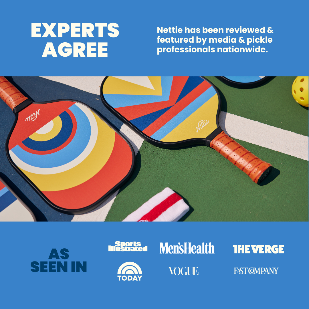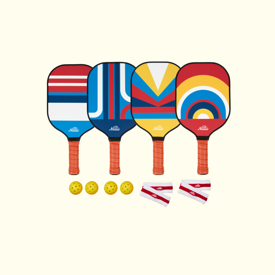 With good gear and good people, you’ll be golden. Enter The Nettie Sets. Our best value and flagship products. Time to round up your people and find (or make) a court! The Nettie Set Family Pack: Building a bigger team? We’ve got you covered! With the Family Pack you get: * 4 pickleball paddles. One of each design. * 4 pickleballs. You can never have enough. * 4 sweatbands. The photos will be amazing. The Particulars: All our paddles are superior quality and designed for pickleball players of all ages and abilities. Nettie paddles are premium plastic with a honeycomb core and a comfy durable sweat-proof grip. 8.0 oz in weight. Dimensions: 15.75 x 7.75 x 0.62. The Perfect Gift: Bonus points! We put a little extra zazz into our packaging when you order The Nettie Set, so whether it’s for a pal who’s brand new to the game, your boss who plays every Wednesday, or your cousin who loves cool packaging, The Nettie Set makes a perfect gift.