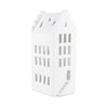 Village House with Stepped Gable Roof features architecture of northern-renaissance revival styles. These fancy gables, which seem to have originated in places like Amsterdam or Lubeck in Germany are charming and beautiful. These gabled roofs were often found overlooking canals, thus the canal house shape of this village house. Available in multiple sizes. Porcelain base holds light source which will glow through the many windows.